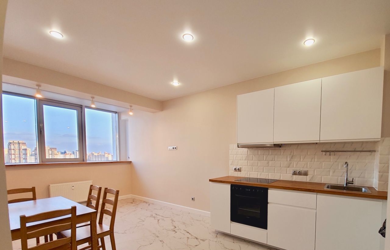 • Просторная кухня-гостиная (18 кв. м.) — здесь легко разместится и обеденная группа, и диван. Большое окно и вид с 15-го этажа наполняют комнату светом.