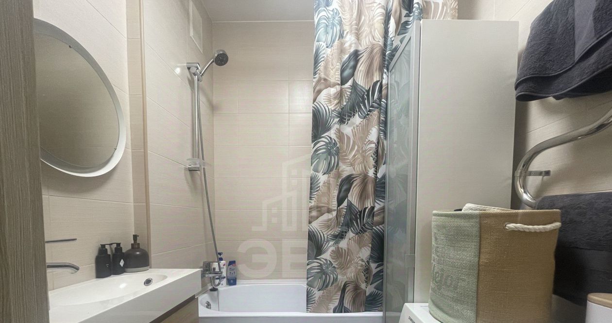 Ванная: современная сантехника, стиральная машина, шкаф для хранения бытовых вещей.