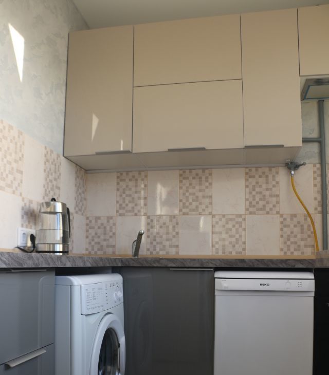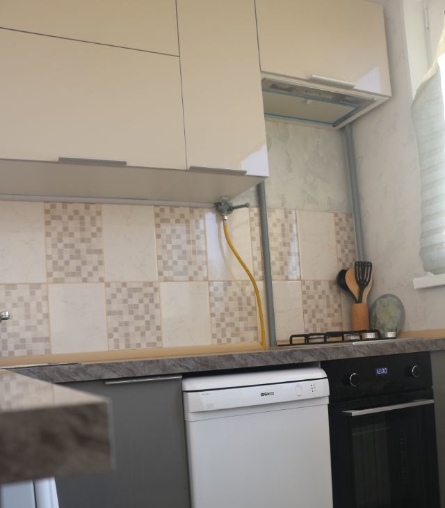 В кухне установлен новый встроенный гарнитур, включающий: посудомоечную машину, стиральную машину, воздуховод, газовую варочную панель, духовой шкаф, холодильник.