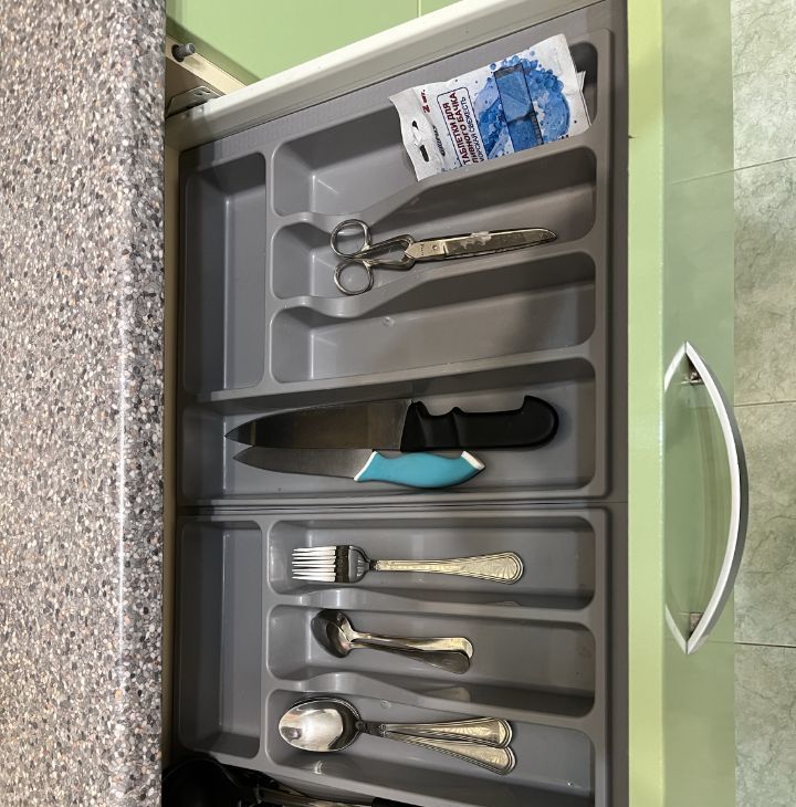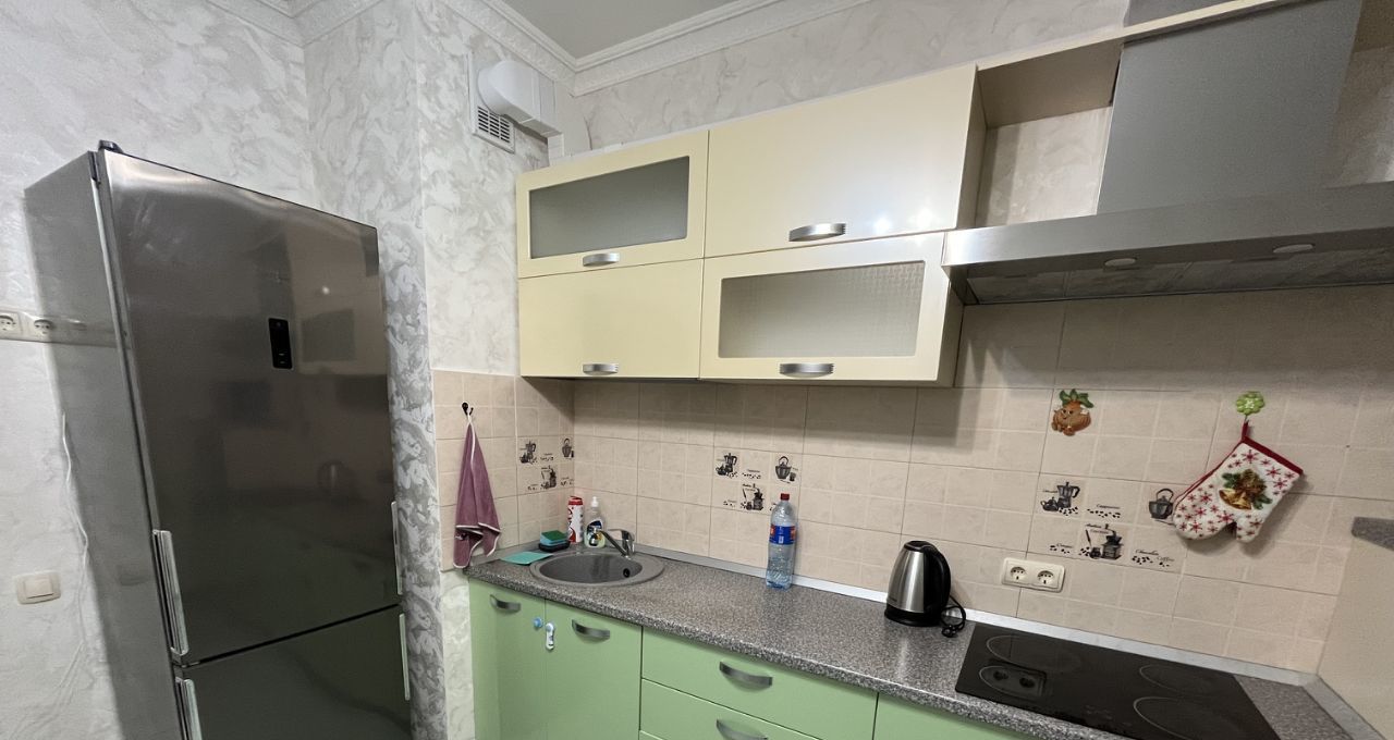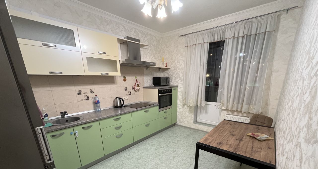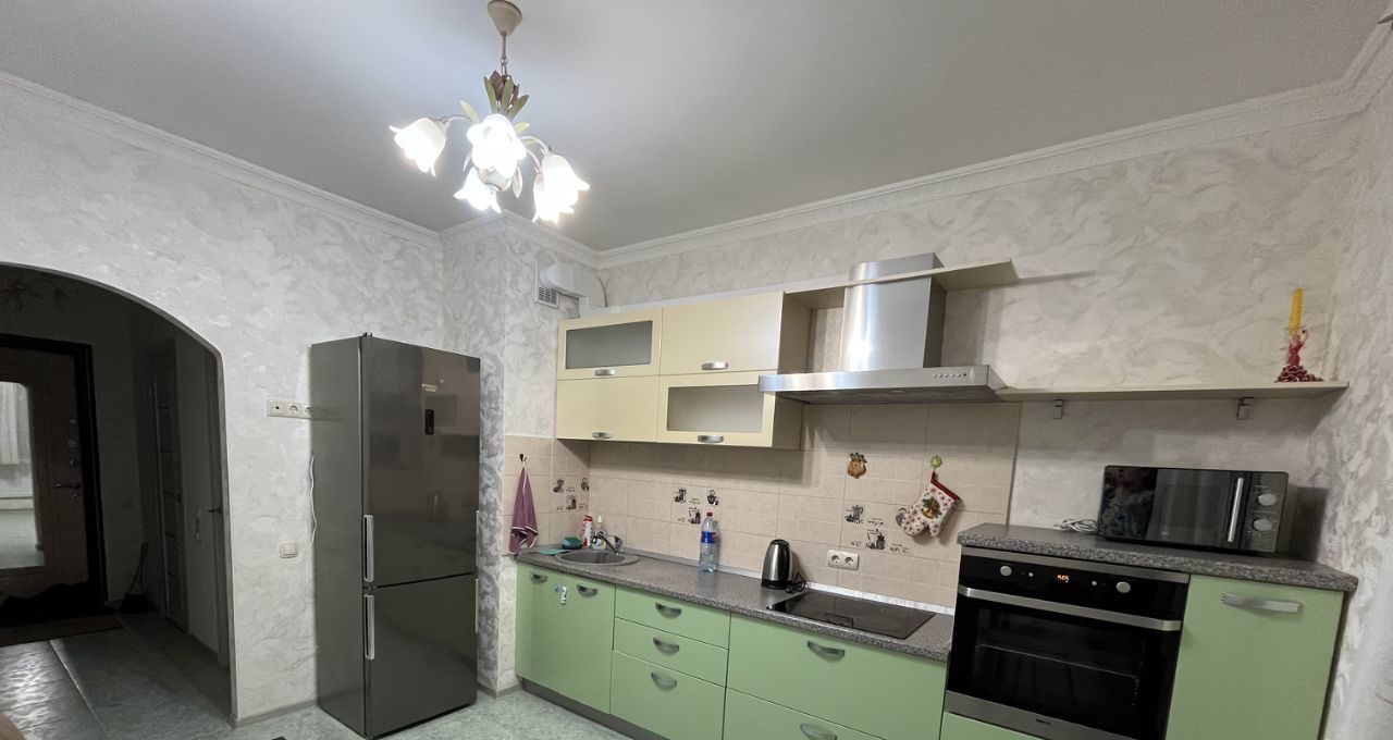 -> Большая кухня 11 кв.м с отличным кухонным гарнитуром, техникой (встроенная электрическая варочная поверхность и духовой шкаф, вытяжка, микроволновая печь и чайник), посудой и иными принадлежностями для быта.