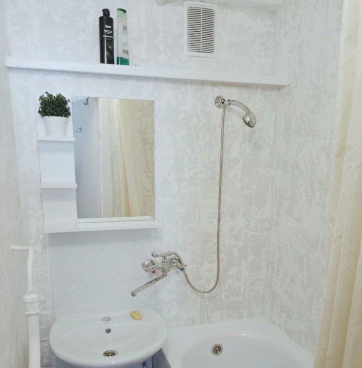 Кухня оборудована необходимой техникой: холодильник, плита и стиральная машина. Из мебели — обеденный стол и стулья. Санузел раздельный, оснащен ванной и раковиной.