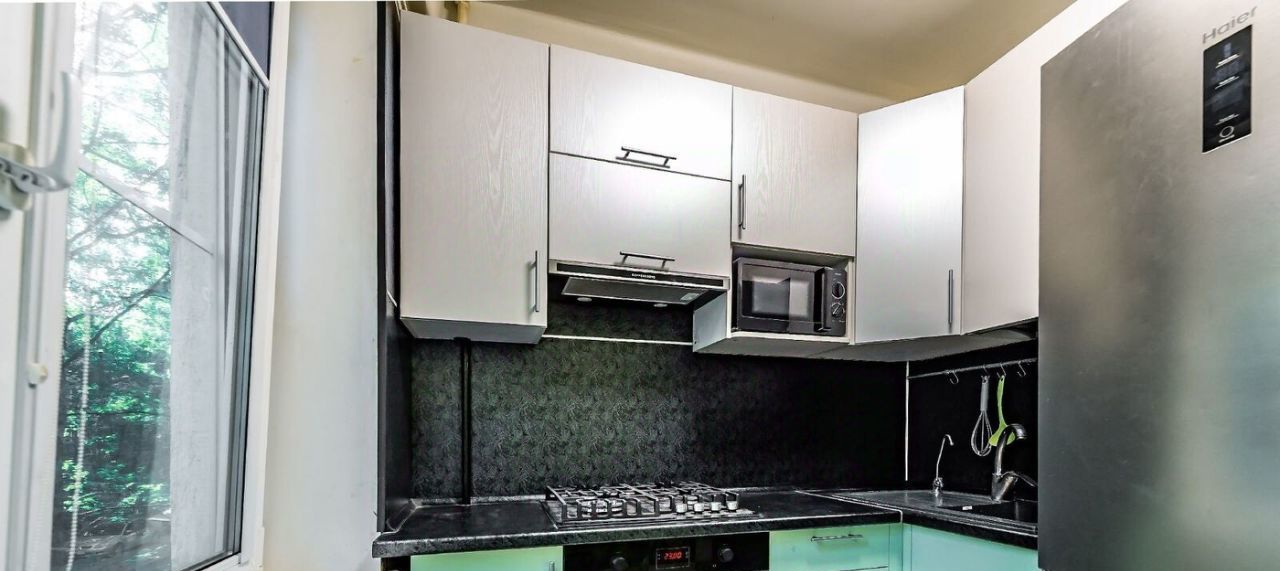 Жилая комната меблирована, как и кухня, что создаёт комфортные условия для проживания. Среди бытовой техники присутствуют телевизор, холодильник, стиральная машина, газовая плита и микроволновая печь. Имеется подключение к интернету.