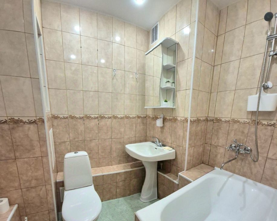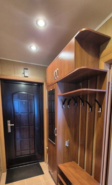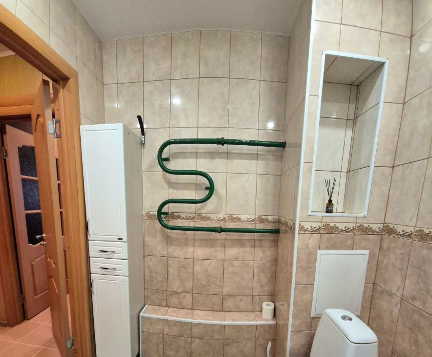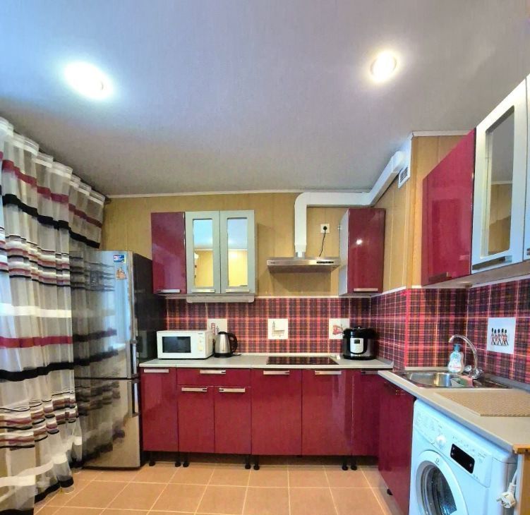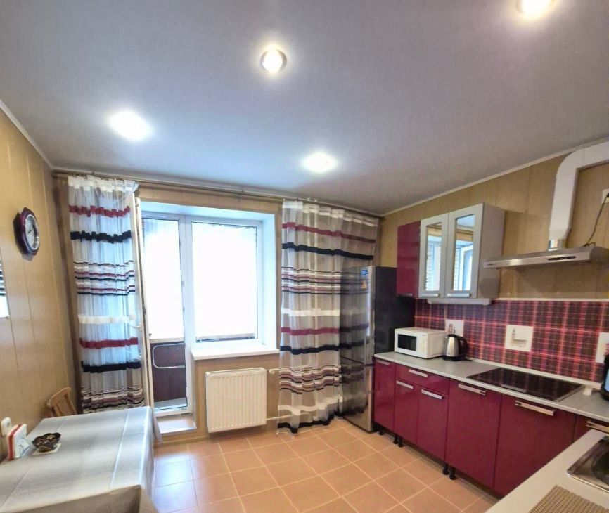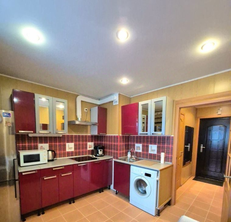 Квартира в прекрасном состоянии, полностью укомплектованная для жизни: встроенная кухня, варочная поверхность, вытяжка, духовой шкаф, микроволновка, мультиварка, чайник электрический, стиральная машина, большой холодильник, стол и стулья, выход на застекленную лоджию из кухни, в комнате - диван, шкаф, телевизор и красивая стенка, в совмещенном санузле - ванная, шкаф-прихожая, также сушилка, гладильная доска, утюг, пылесос.