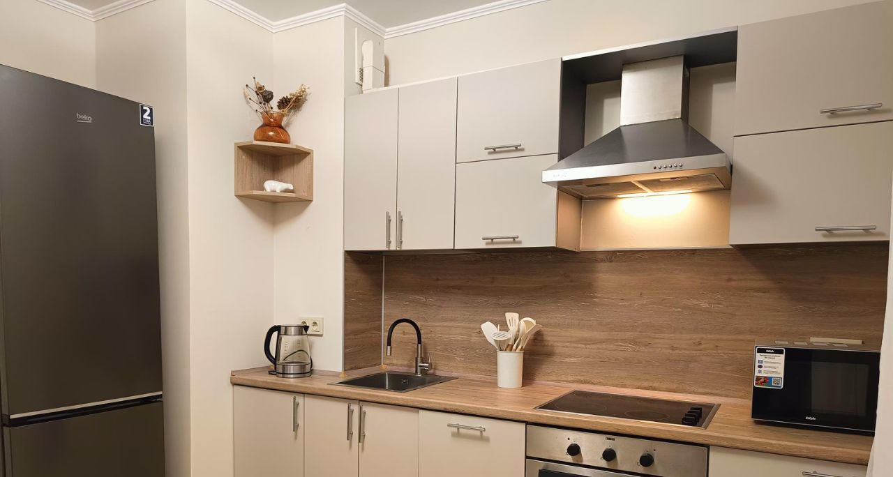 Квартира оборудована всей необходимой техникой - телевизор, холодильник, посудомоечная машина, микроволновка, варочная панель, духовка, стиральная машина, пылесос и даже отпариватель. Ничего покупать не надо - есть все вплоть до новой посуды!