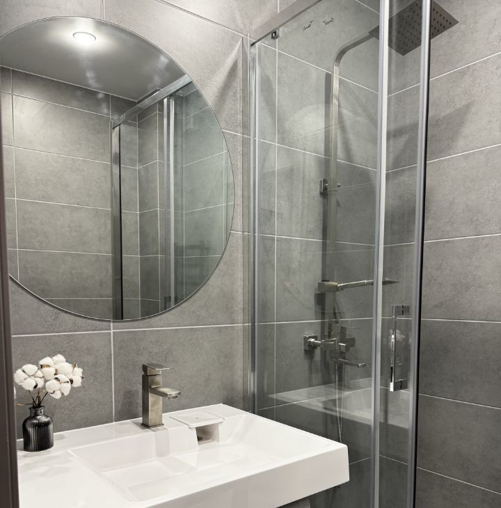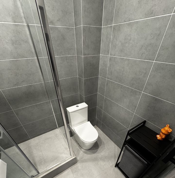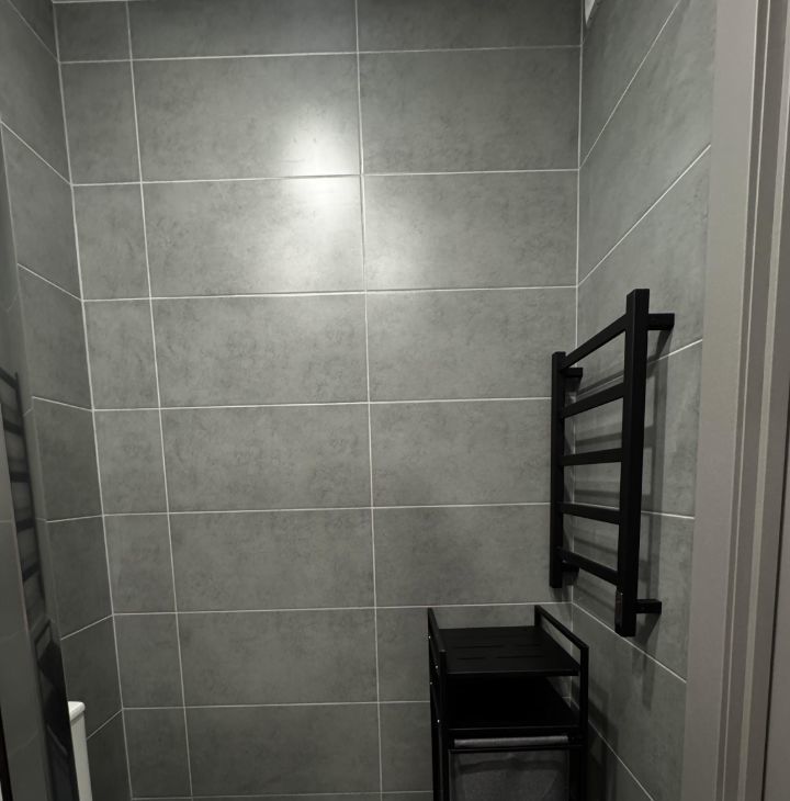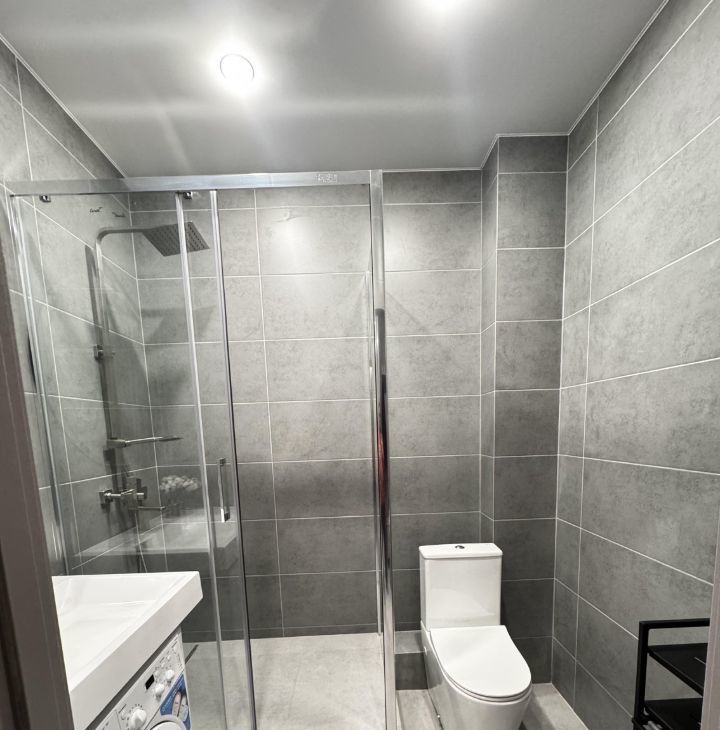 В санузле просторная душевая кабина, стеллаж для вещей, стиральная машина.