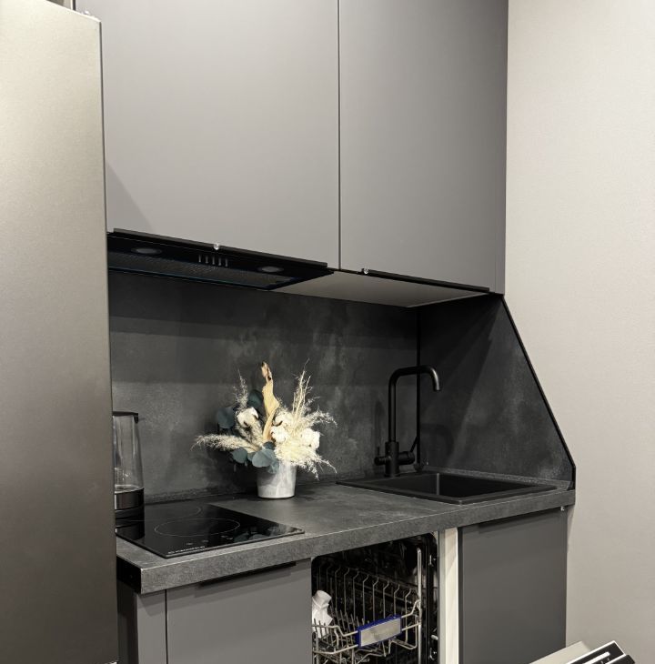 В кухонной зоне варочная панель, вытяжка, холодильник, посудомоечная машина, аэрогриль и чайник.