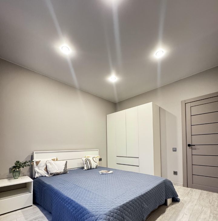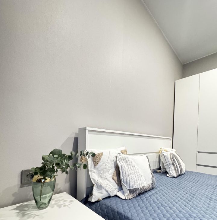 В спальне большая кровать с ортопедическим матрасом и удобным 4-створчатым шкафом.