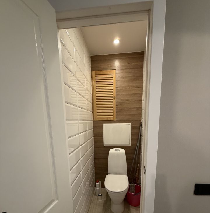 Санузел раздельный: стиральная машина, шкафчик для хранения.