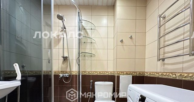 -Совмещённый санузел с настенной плиткой от пола до потолка. Душевая кабина.