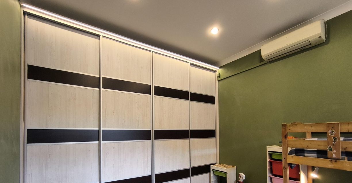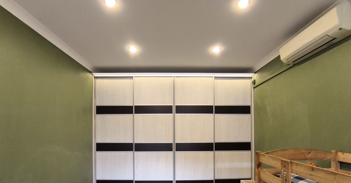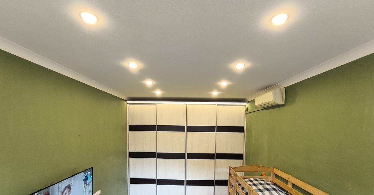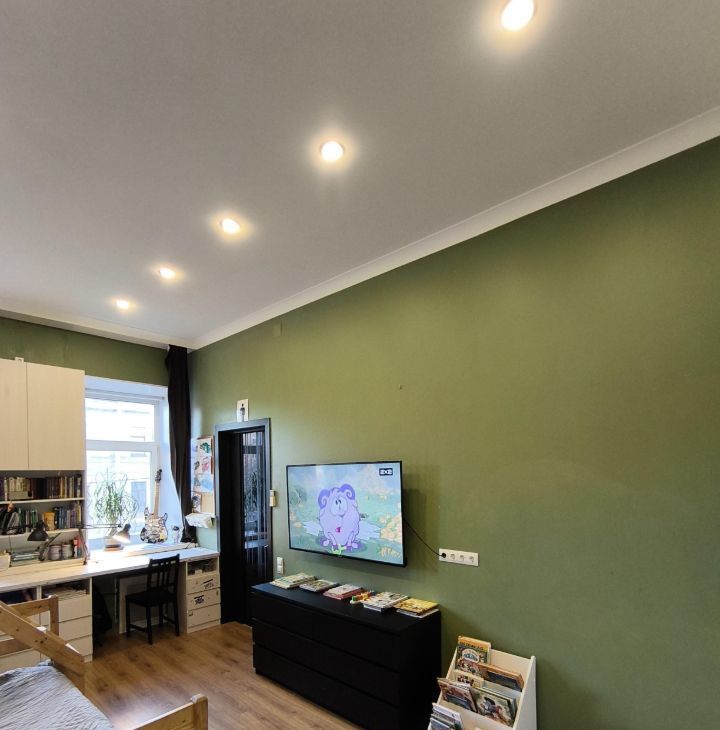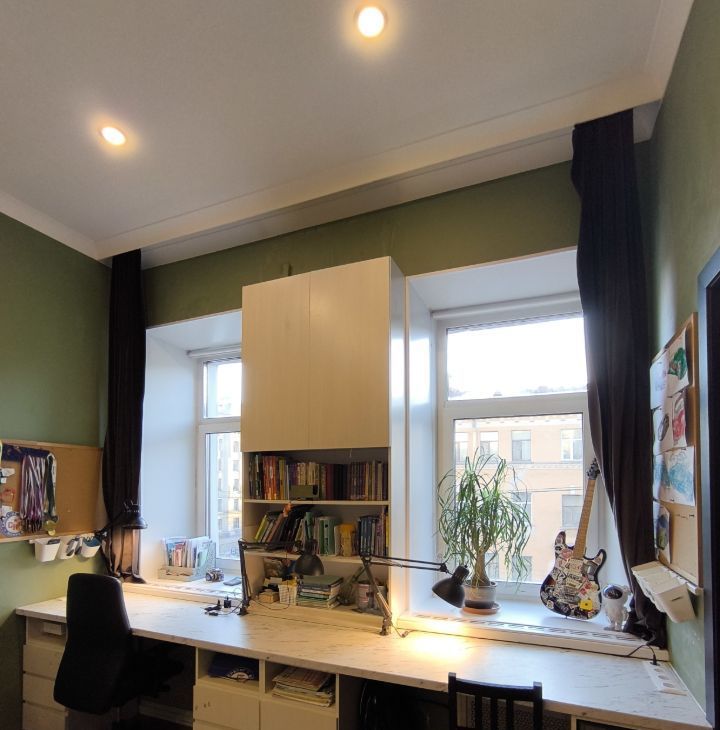 Спальня оформлена в спокойных тонах, с большим окном на солнечную сторону, что обеспечивает естественное освещение. В комнате установлены удобные кровати и рабочая зона с книжными полками.