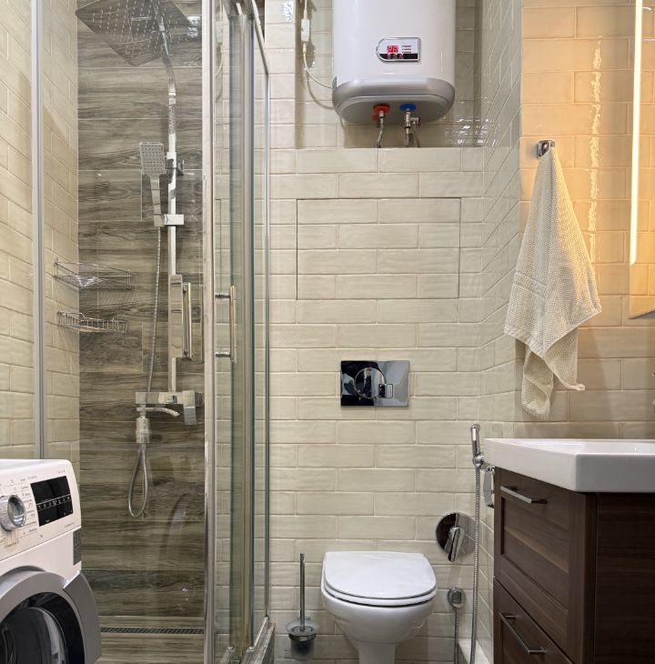 Полностью оборудована мебелью и техникой: посудомоечная и стиральная машины, кондиционер, телевизор, духовка, бойлер для горячей воды.