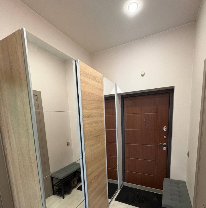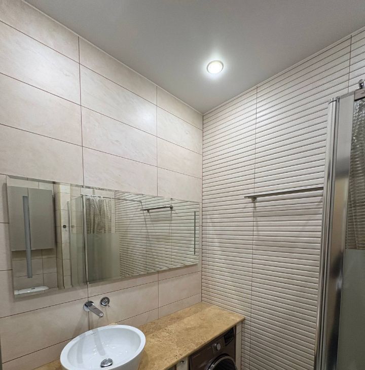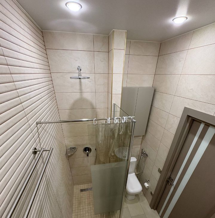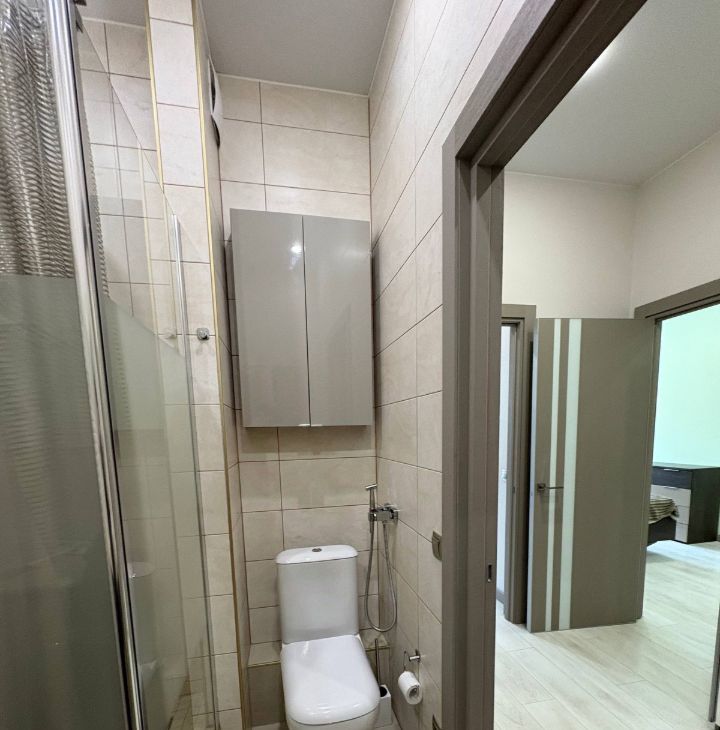 В санузле есть просторная душевая кабинка, большое зеркало с дополнительной подсветкой, подвесной шкаф для хранения личных вещей, гигиенический душ, стиральная машина, вентиляция. Прихожая оснащена вместительным шкафом для хранения верхней одежды и прочих вещей.