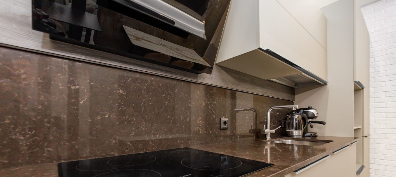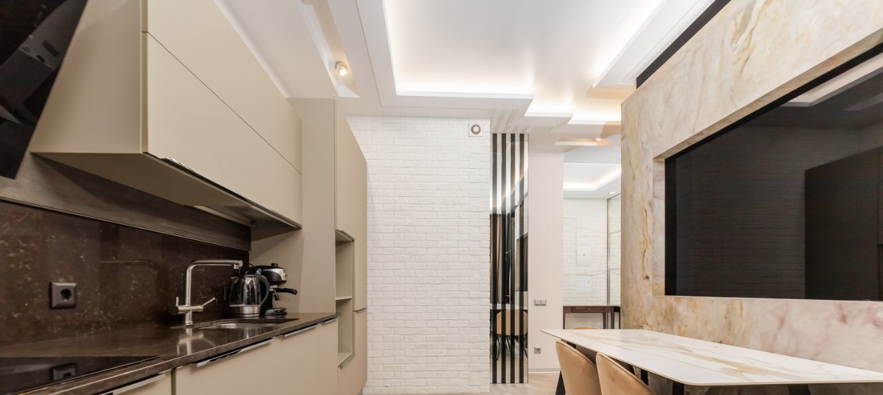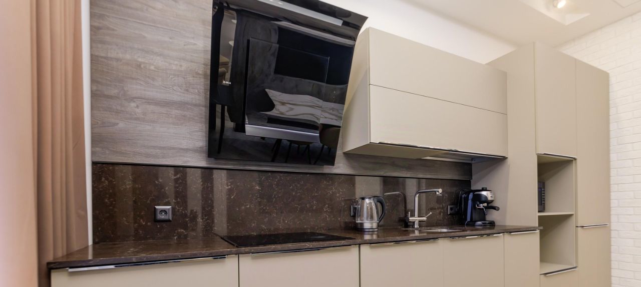• Современная кухня-столовая со всей техникой: холодильник, стиральная и посудомоечная машины, электроплита, микроволновка, кофемашина, чайник