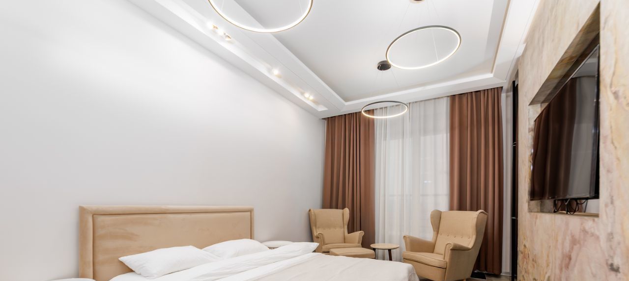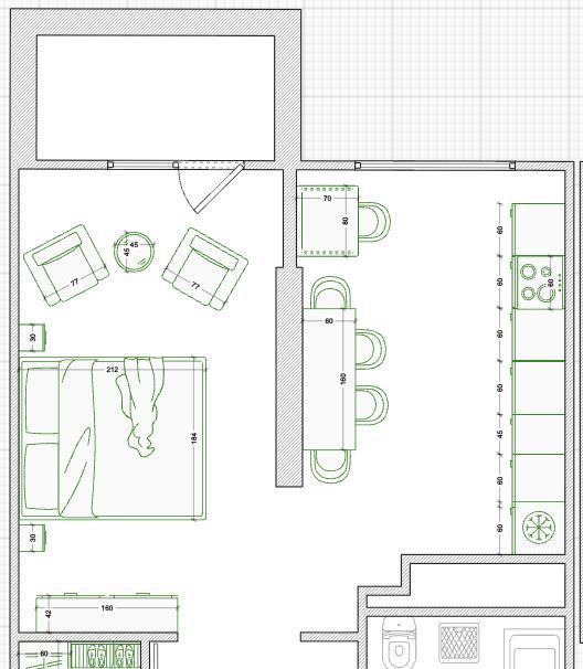 • Спальня с двуспальной кроватью, телевизором, комодом, зоной отдыха и работы, выходом на балкон