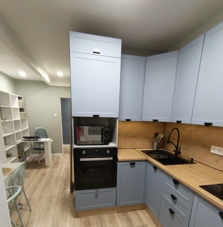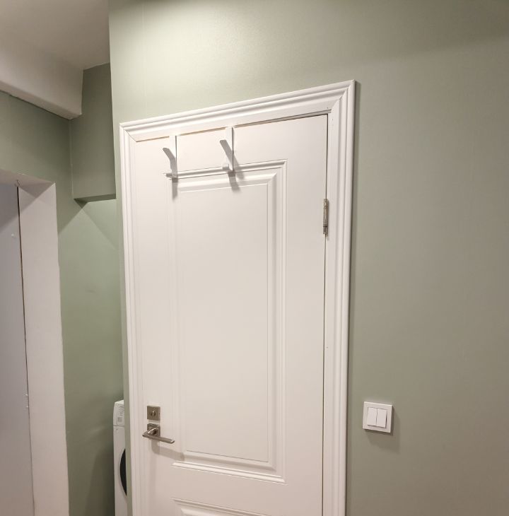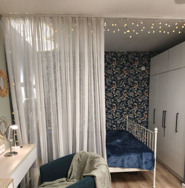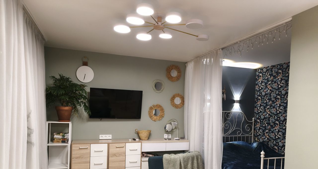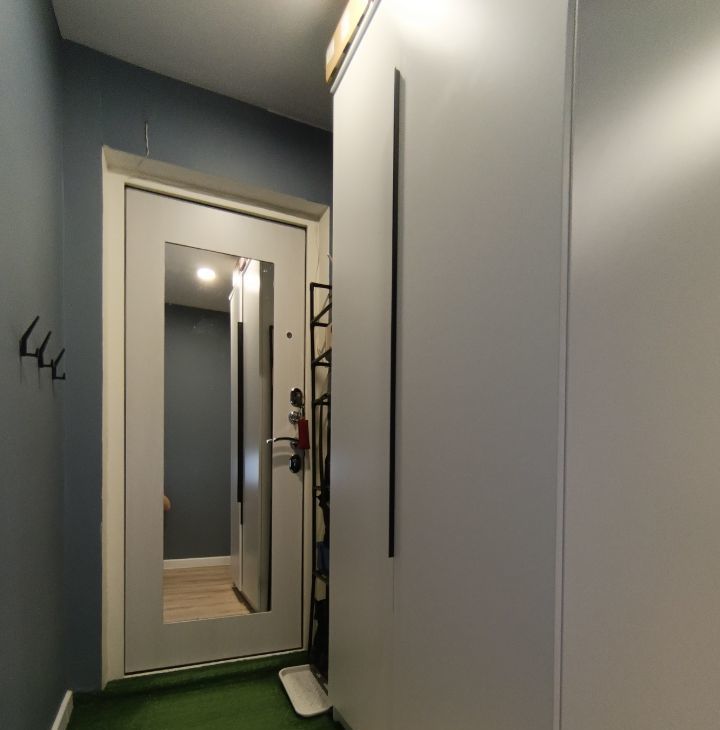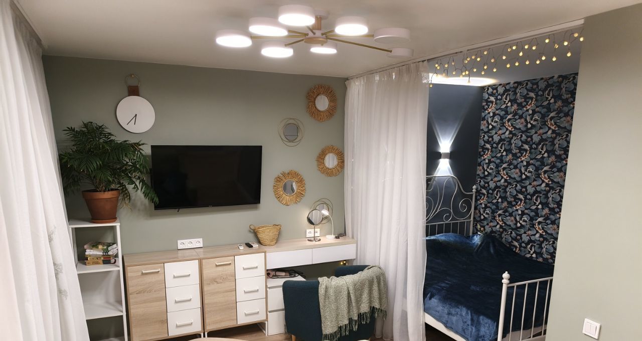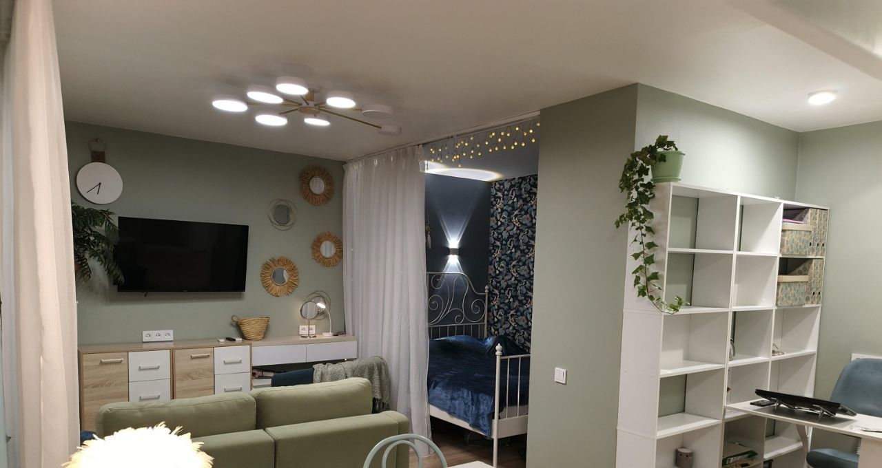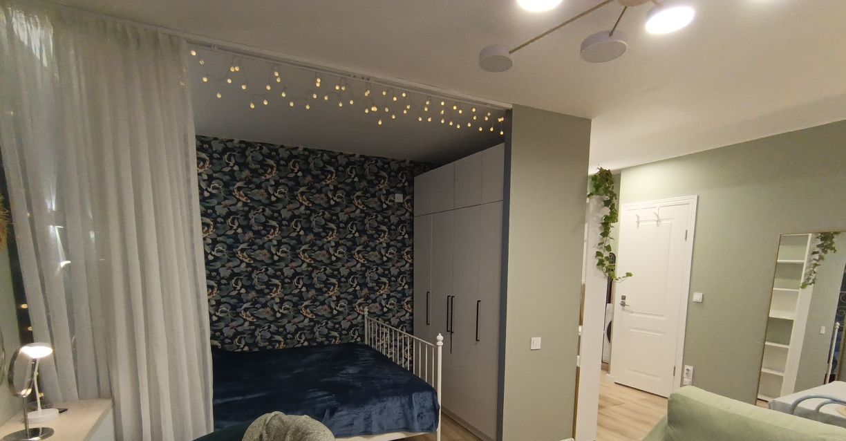 - Действительно удобная планировка: большая вместительная кухня, много мест хранения, дополнительное спальное место на диване, кабинет, макияжный стол и даже хранение на балконе.