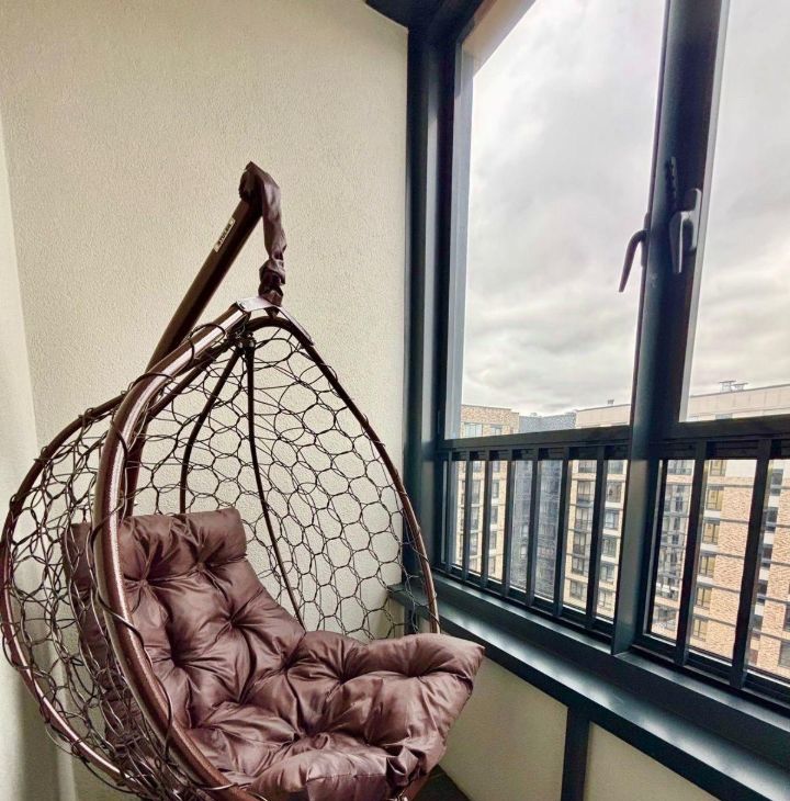 - застекленная лоджия с видом на город так как высокий этаж и кресло-кокон.