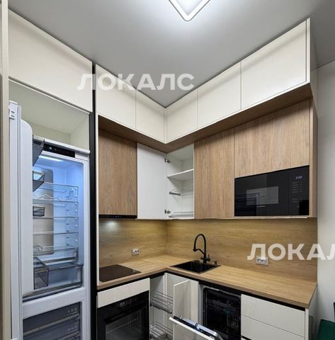 Кухня: современный кухонный гарнитур, встроенный двухкамерный холодильник, духовой шкаф с щупом для приготовления, индукционная плита на 3 конфорки, вытяжка, посудомоечная машина, встроенная микроволновая печь, кран с встроенным фильтром для воды. Удобный раскладной диван, круглый раскладной стол и стулья, телевизор с голосовым управлением Яндекс.Алиса диагональю 55.