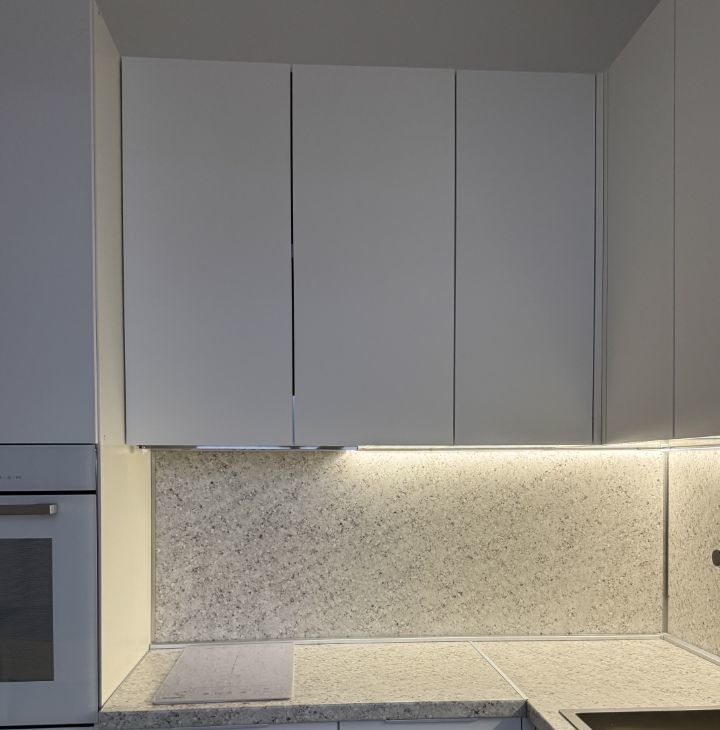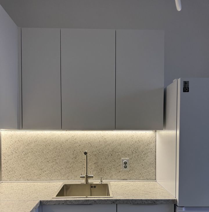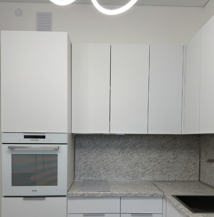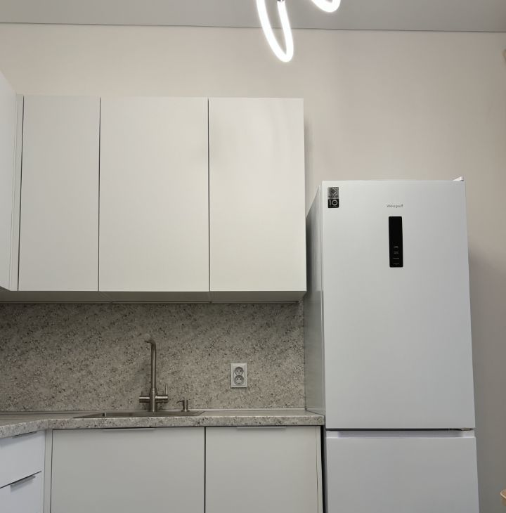 - Кухня со встроенной индукционной плитой, духовка с СВЧ 2 в 1, тихий холодильник, раковина с дозатором для жидкого мыла и смеситель с фильтром для питьевой воды