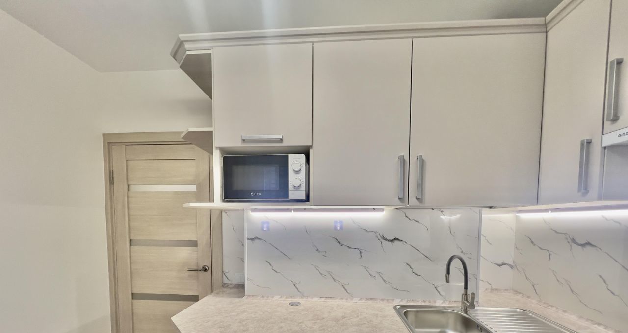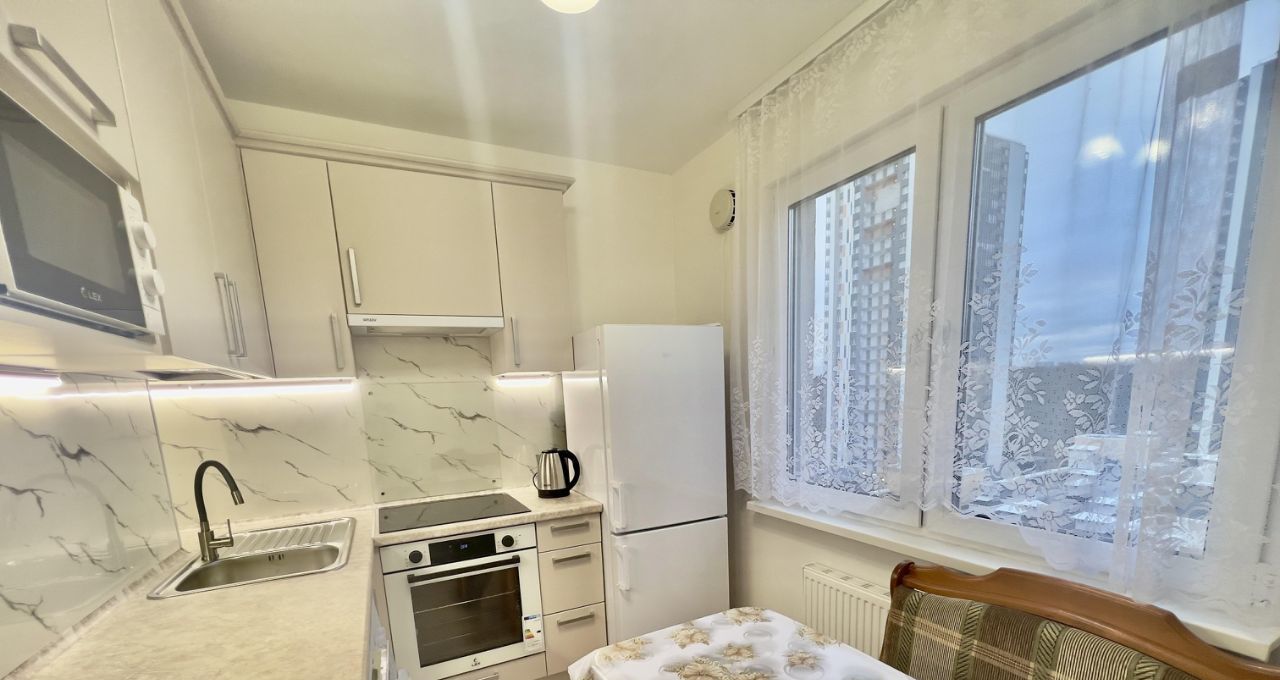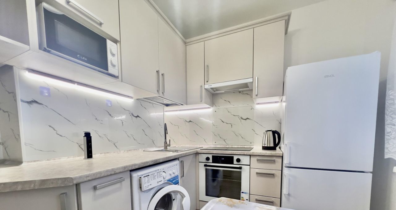 Выполнен качественный современный ремонт, квартира полностью укомплектована всей необходимой мебелью и бытовой техникой — подходит для комфортного проживания без дополнительных вложений. Уютная кухня, большая комната и очень просторная лоджия (возможно использование под рабочую зону или хранение)