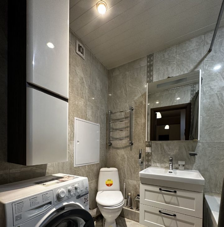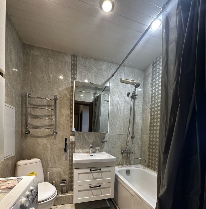 санузел совмещенный, большой, с ванной, установлена стиральная машинка.