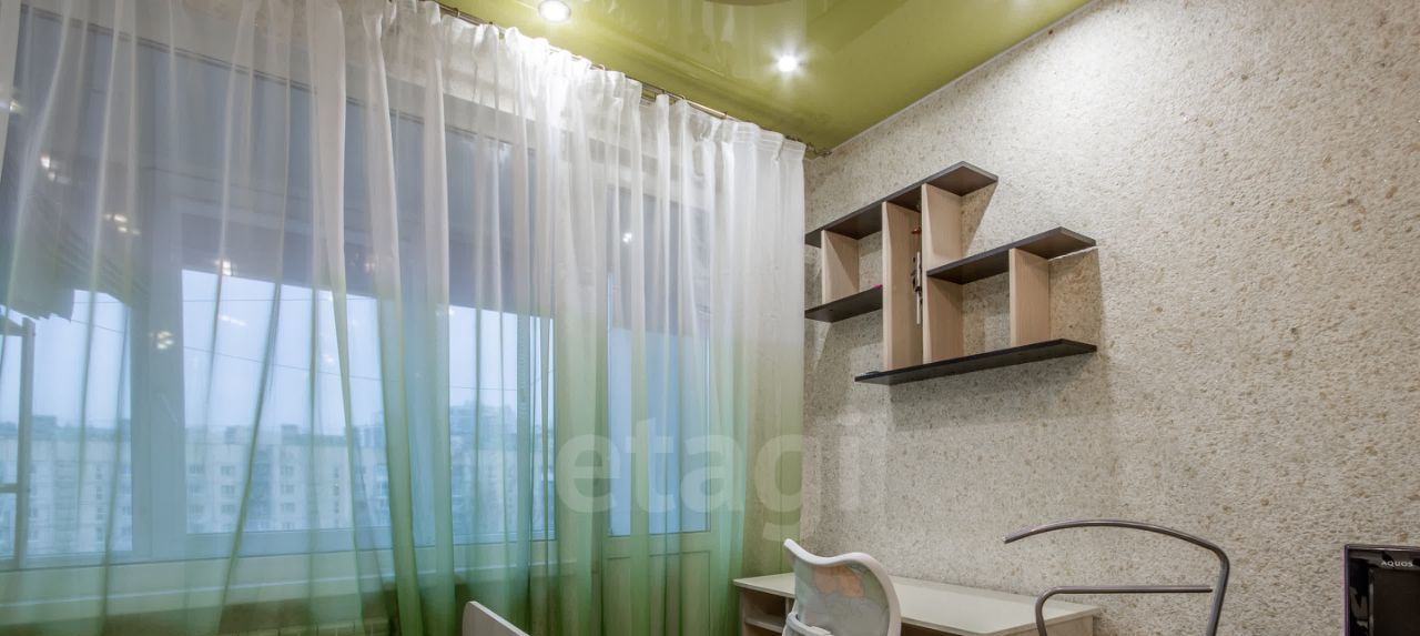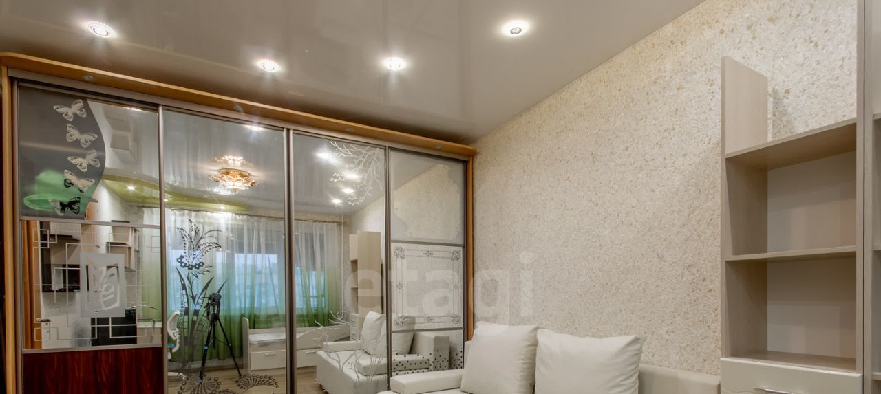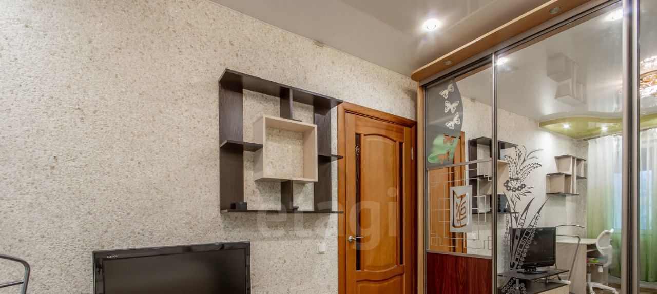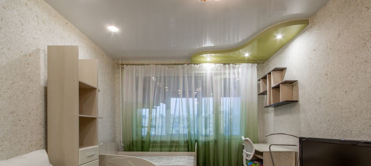 Большая комната с раскладным диваном и односпальной кроватью. Оборудовано рабочее место, есть телевизор. Шкаф-купе во всю стену.