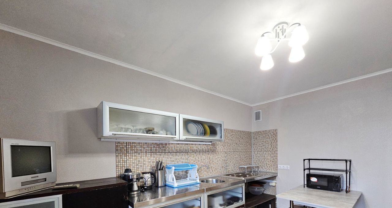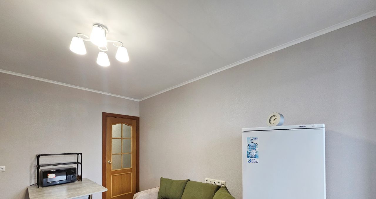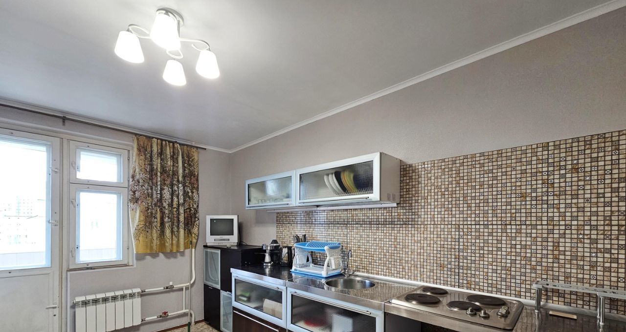 На кухне установлен кухонный гарнитур, раскладной диванчик, стол, стулья. Из техники: варочная поверхность, двухкамерный холодильник, новая микроволновая печь. Выход на застекленную лоджию.