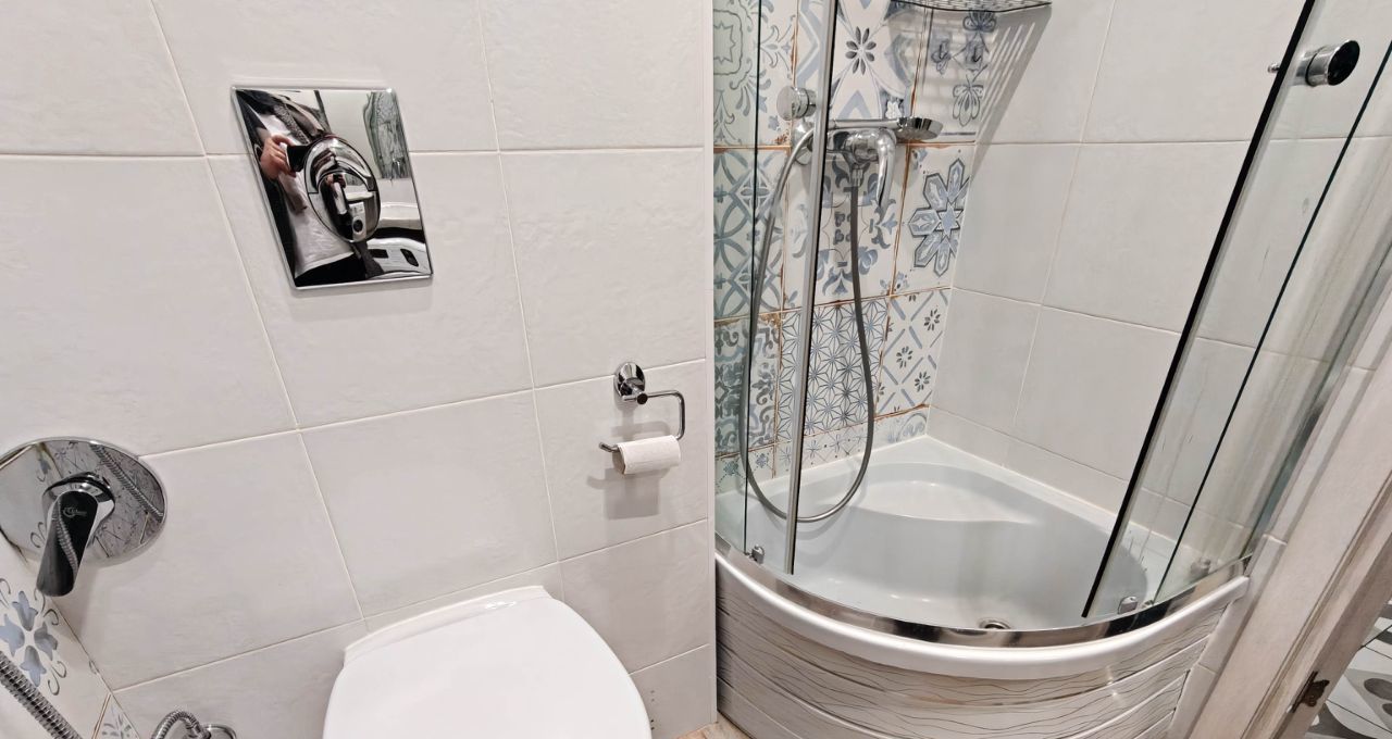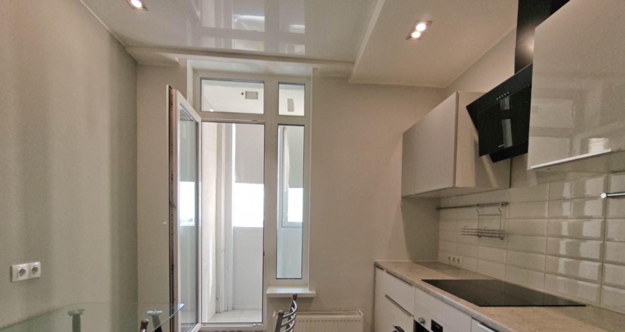 Кухня -столовая 9.0 кв.м. с выходом на лоджию 2.2 кв.м. Жилая комната 19.3 кв.м. Прихожая 5.7 кв.м. с гардеробом 1.7к в.м. Совмещенный санузел с душевой кабиной и современной сантехникой. Потолки 2.8 м. Выполнен современный ремонт. Вид из окон на улицу.