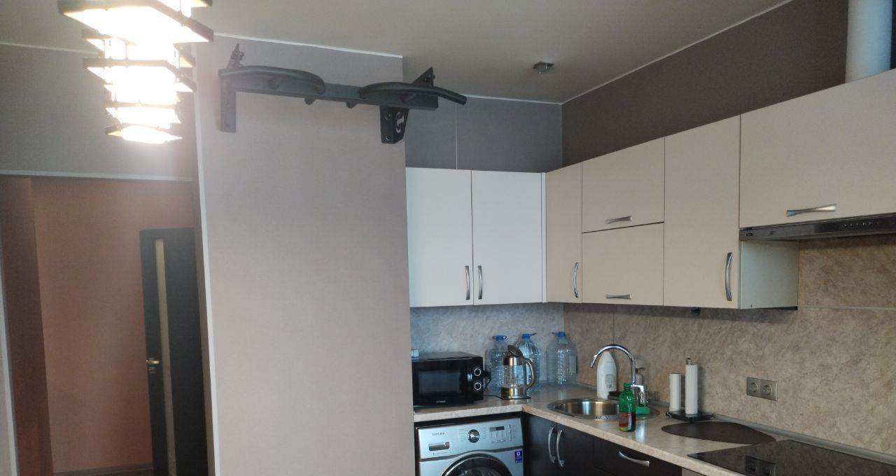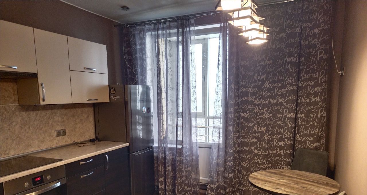 На кухне встроенная мебель, электрическая варочная панель, духовой шкаф,кухонный стол, холодильник,ст.машина.