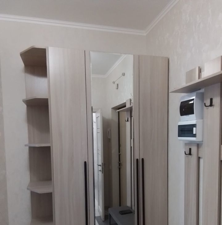 - В прихожей шкаф для одежды с зеркалом.Вешалка и обувница.