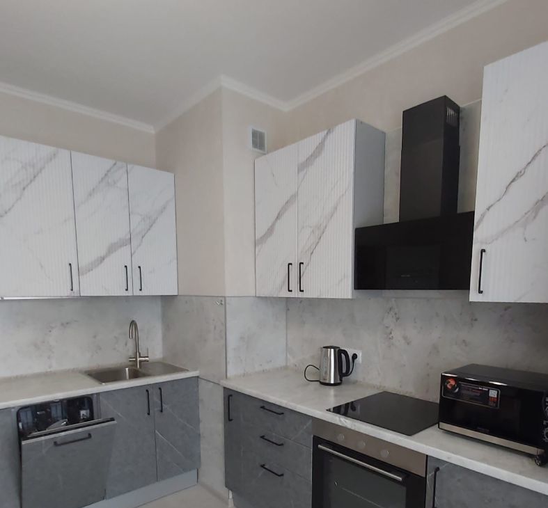 - Встроенная кухня с бытовой техникой ( варочная панель, духовой шкаф, вытяжка, посудомоечная машина, холодильник, микроволновая печь), а в зоне отдыха есть диван (раскладной) и обеденный стол.