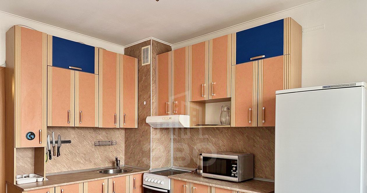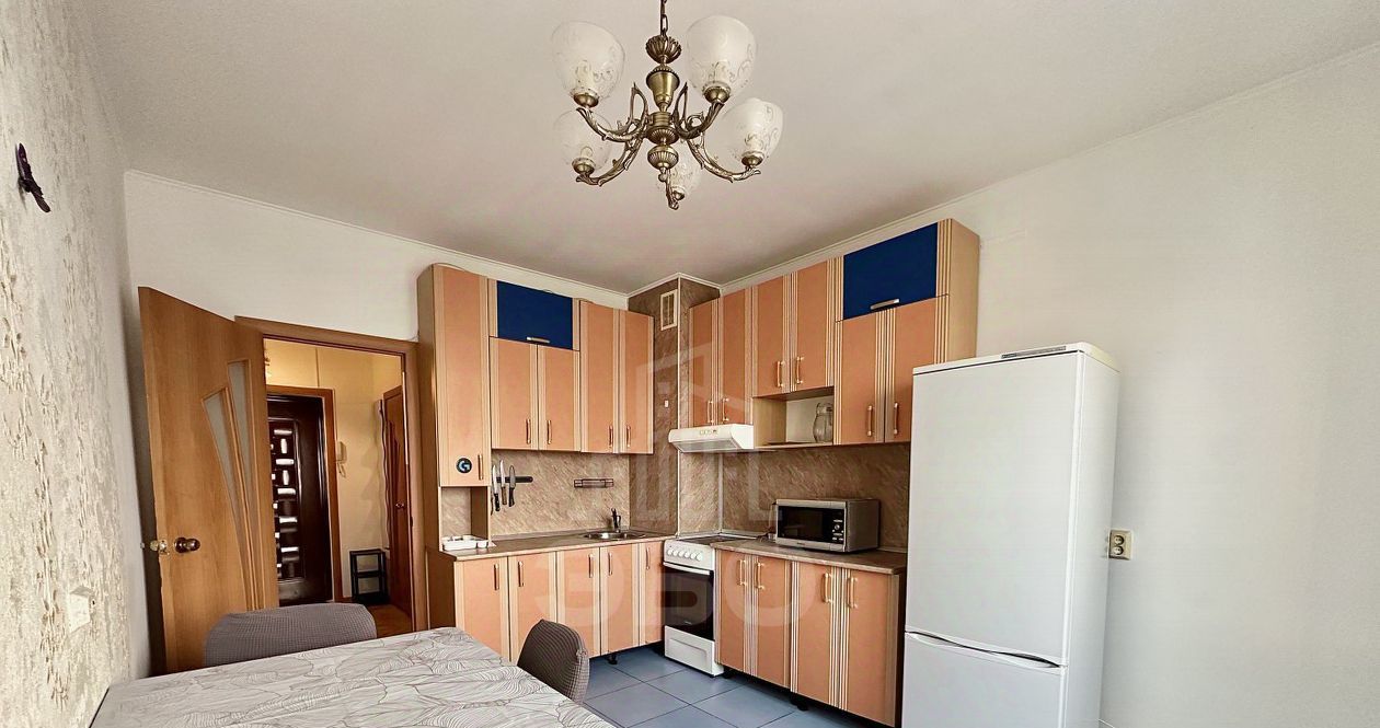 Большая кухня 12 м² — есть возможность поставить диван. Полностью укомплектована: кухонный гарнитур, обеденная зона, холодильник, варочная панель, духовка, микроволновка, чайник.