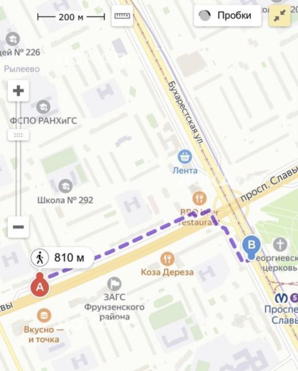 Сдаётся уютная однокомнатная квартира в кирпичном доме на 8 этаже из 9. Общая площадь — 36 кв. м, жилая — 16 кв. м, кухня — 9 кв. м. Высокие потолки 2.6 метра создают ощущение простора. Дом находится всего в 8 минутах пешком от метро "Проспект Славы", что делает его расположение особенно удобным для тех, кто ценит городскую динамику.