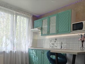 Кухня оснащена газовой плитой с духовкой, холодильником, микроволновой печью, мультиваркой, чайником и фильтром для воды и антресолью. Необходимую посуду и приборы оставим в пользование. На кухне можно опустить жалюзи.
