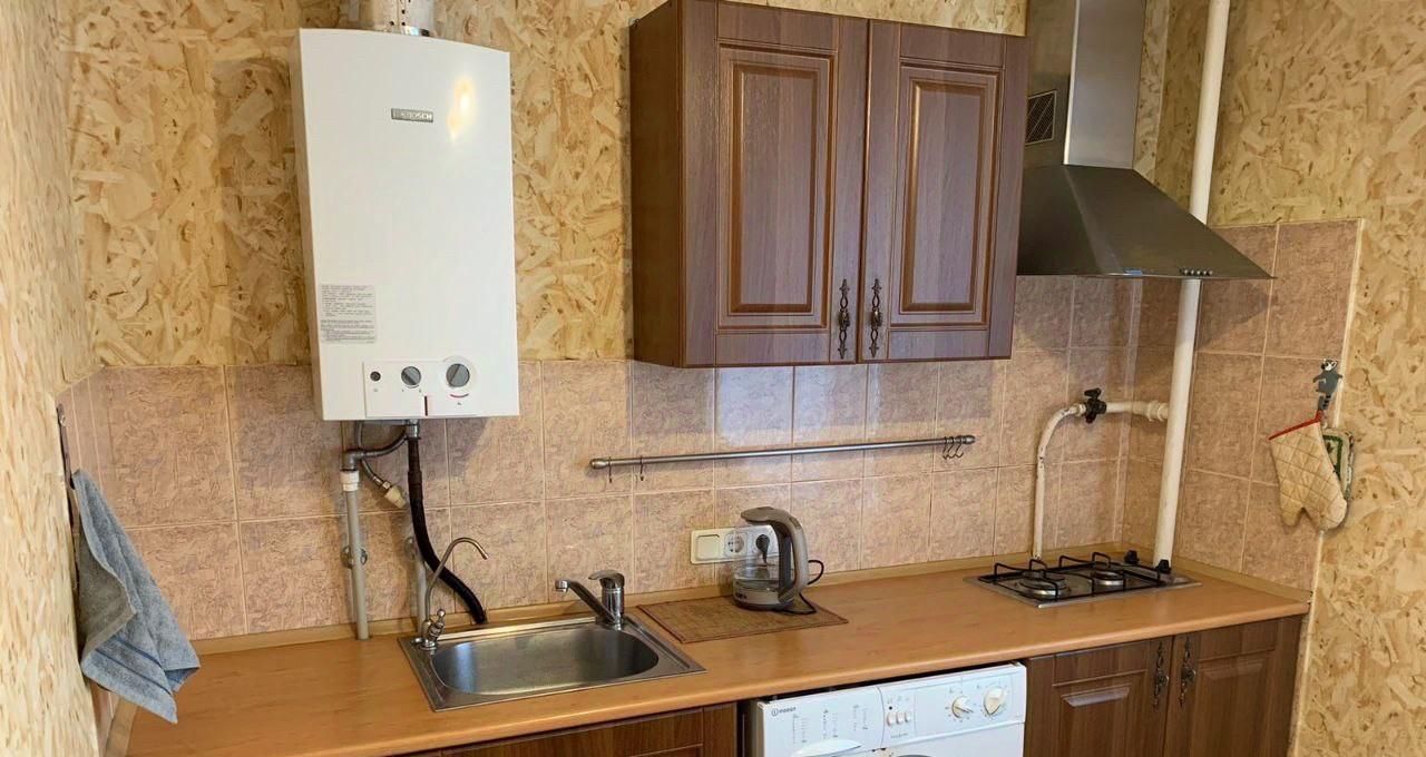 Вполне приличный кухонный гарнитур, удобный диванчик, стол и стулья, газовая плита, микроволновка, электрический чайник, холодильник.