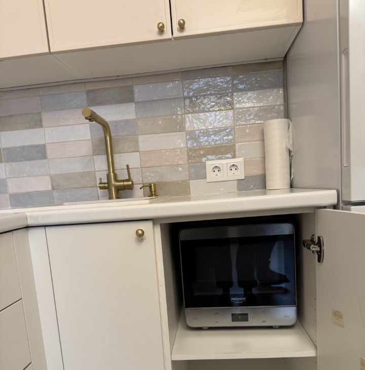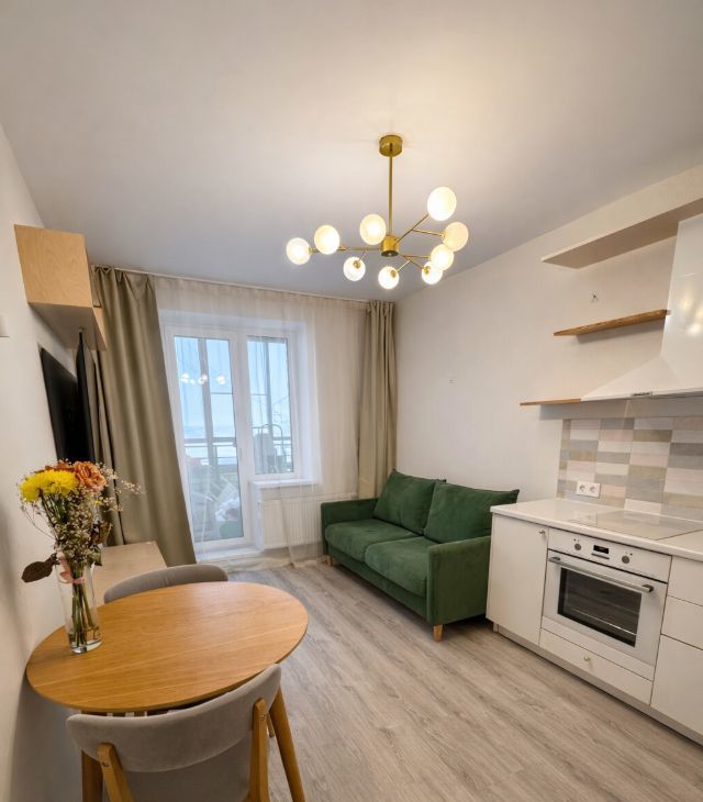 Кухня-гостинная просторная, площадью 14 м², оснащена необходимой бытовой техникой: холодильником, плитой + духовкой и микроволновой печью. Из мебели — вместительные шкафы и обеденный стол. В гостиной части установлен телевизор и удобный раскладной диван. Балкон вместительный с видом на город.