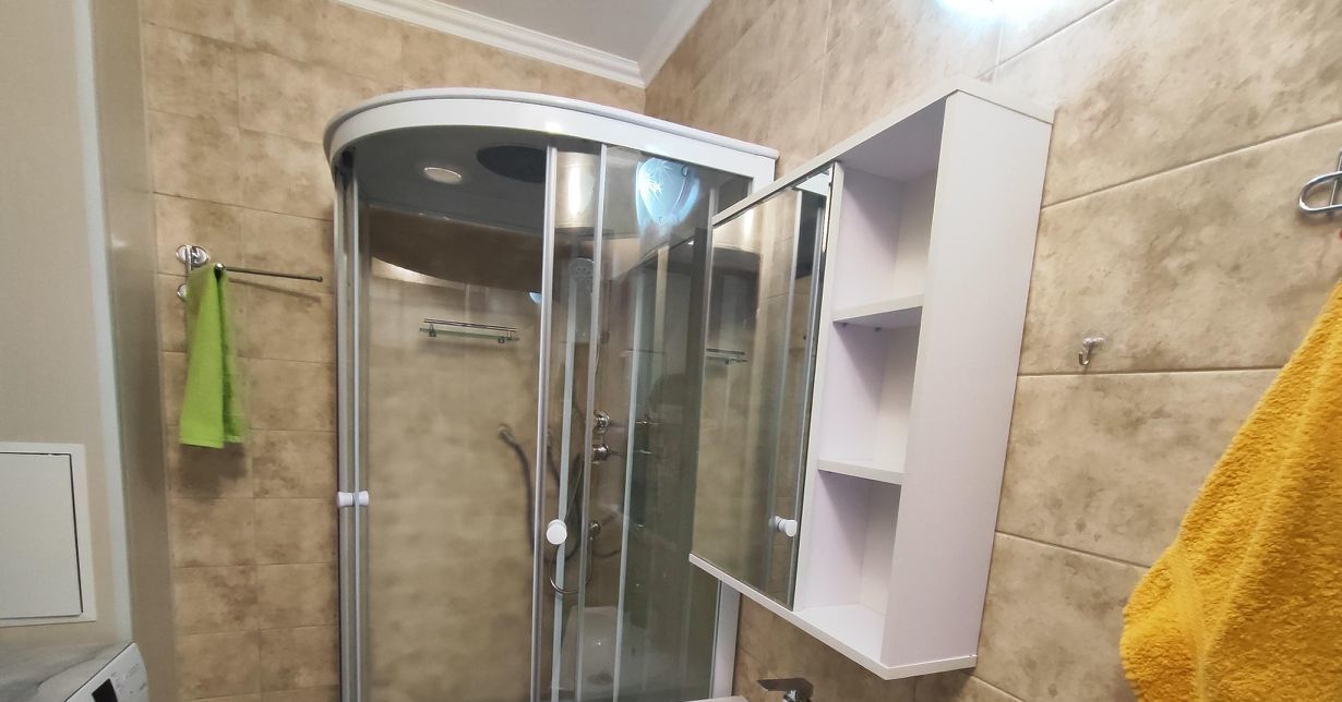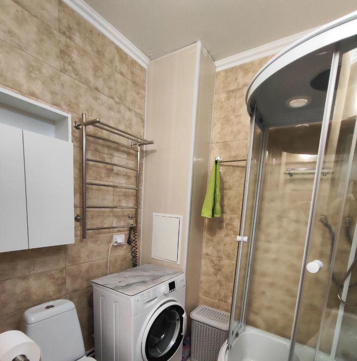 В квартире выполнен косметический ремонт, поэтому она выглядит свежо и аккуратно. На кухне и в комнате есть вся необходимая мебель, а из техники — холодильник, телевизор, микроволновая печь, чайник и стиральная машина. В совмещённом санузле установлена душевая кабина, поэтому можно быстро освежиться после рабочего дня. Интернет проведён, поэтому вы всегда будете на связи.
