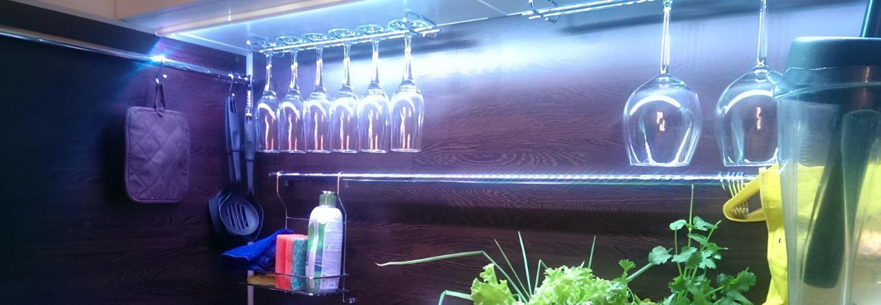 Кухня отделена от обеденной зоны барной стойкой с диодной подсветкой.