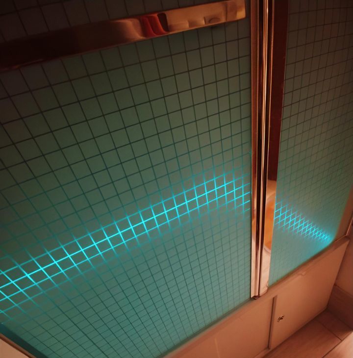 Ванна с диодной подсветкой и непрозрачной стеклянной шторкой с дверцей, качественная сантехника в с/у, в туалете гигиенический душ с обратным клапаном,