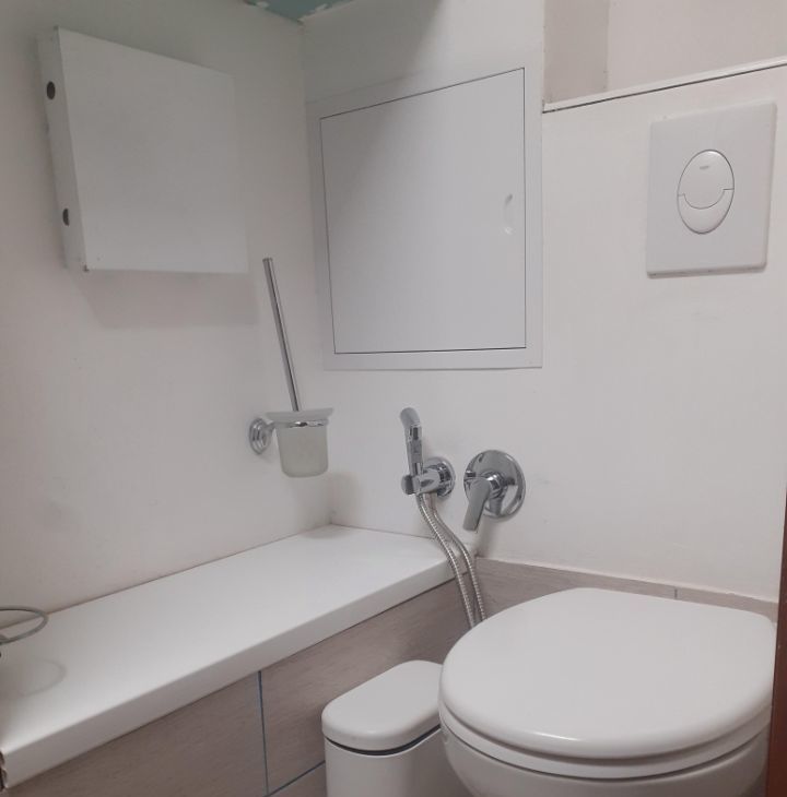 принудительная вытяжка, вместительный зеркальный шкаф с подсветкой и скрытыми розетками для бритв, щеток и прочего, подвесной унитаз.