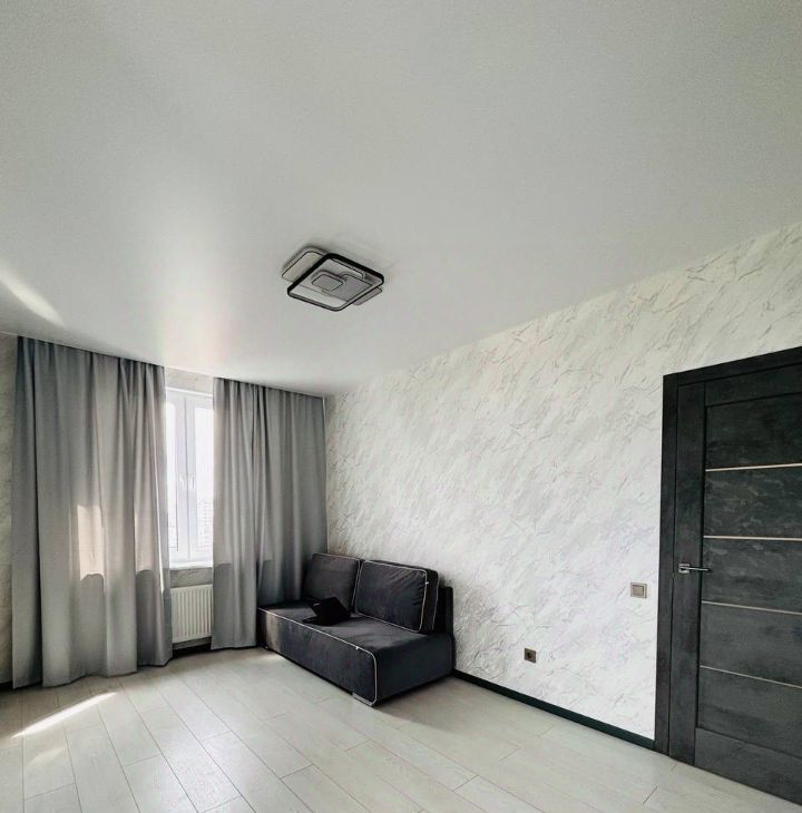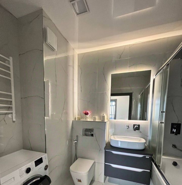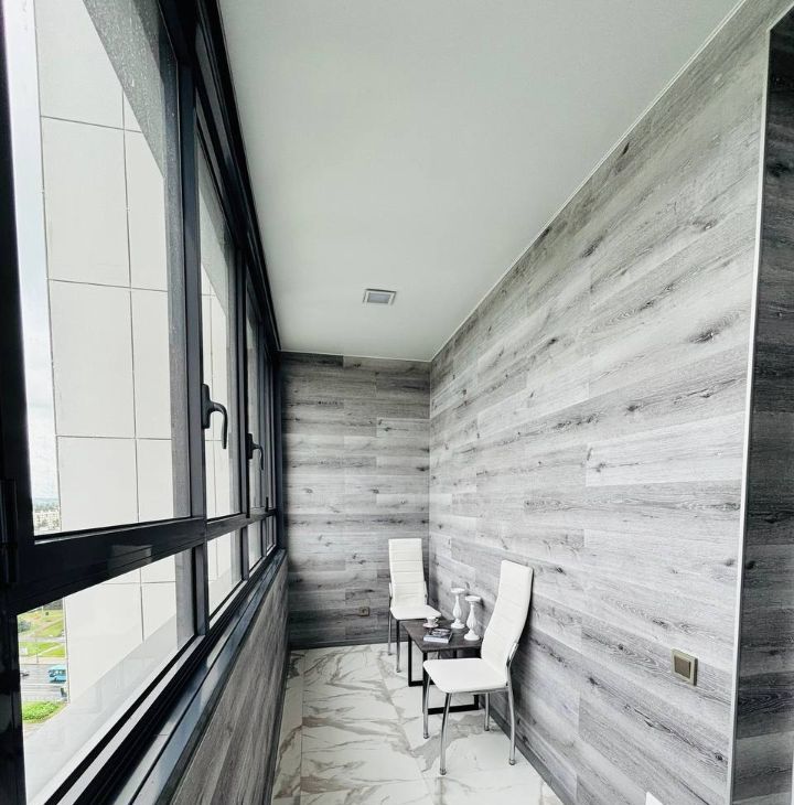 - Стильные натяжные потолки: сатиновые в комнатах и глянцевые в санузле и лоджии.