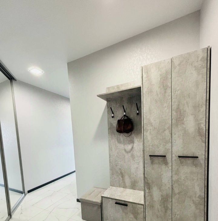 - Пол в кухне, коридоре и санузле выполнен из керамогранита, в комнате влагостойкий ламинат, что обеспечивает долговечность и легкость в уходе.