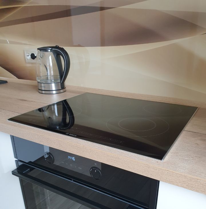 Кухня полностью укомплектована бытовой техникой: Духовой шкаф/Варочная панель/ Посудомоечная машина/Холодильник/ Микроволновка/ Чайник/Стиральная машина.