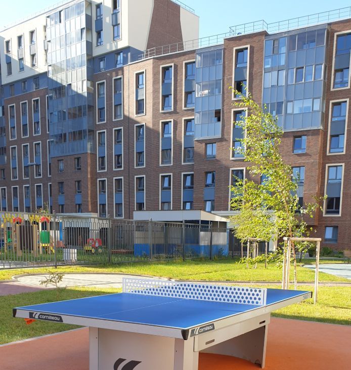 Ухоженный закрытый двор без машин. Во дворе есть: теннисные столы, тренажёры для занятий спортом, велосипедная дорожка.