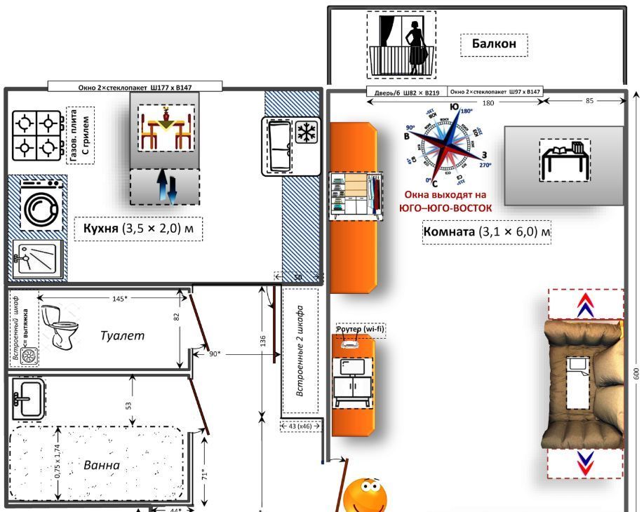 +Стеклопакеты окон двухкамерные, с жалюзи, без пыльных штор; балкон;