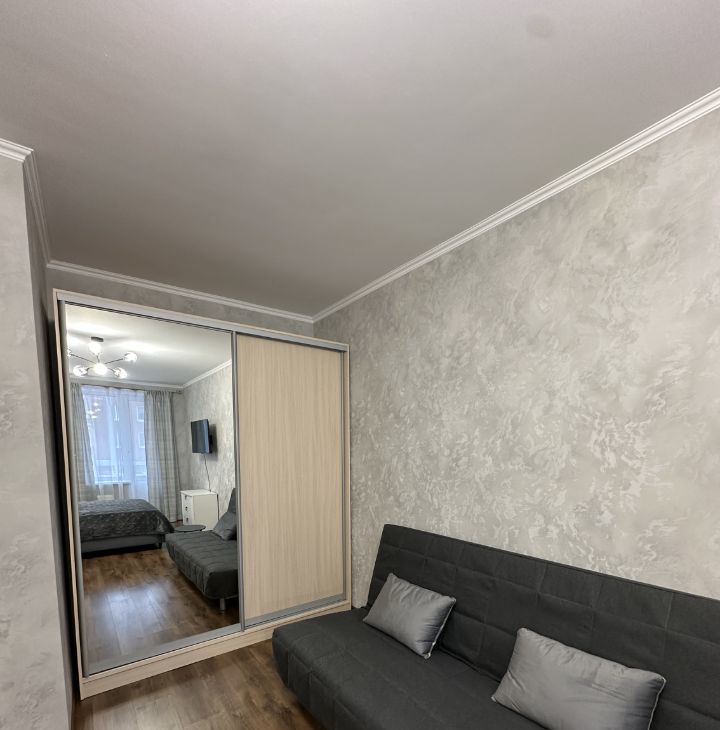 Комната: Кровать двуспальная с подъемным механизмом 160х200 с новым ортопедическим матрасом. Раскладной диван 160х200. Текстиль новый. Большой шкаф-купе, комод и две прикроватные тумбочки. Смарт TV. Застреленный балкон.