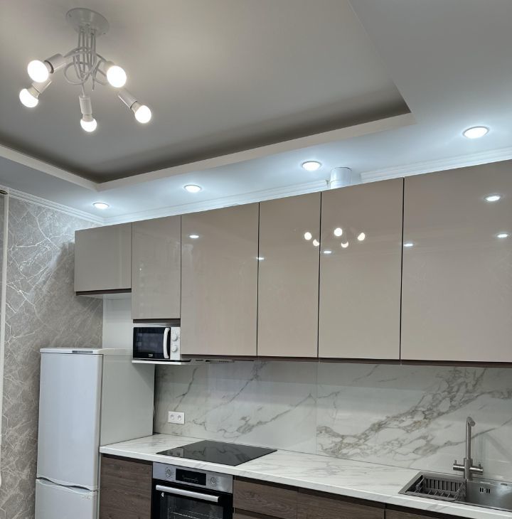 Кухня оснащена посудомойкой, индукционная варочная панель, духовка, микроволновка, холодильник, вытяжка. Стоит фильтр для воды. Столовый сервиз на 6 персон и столовые приборы.