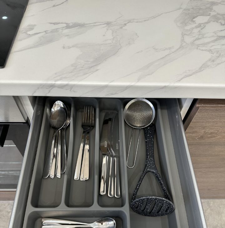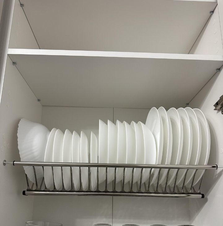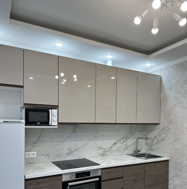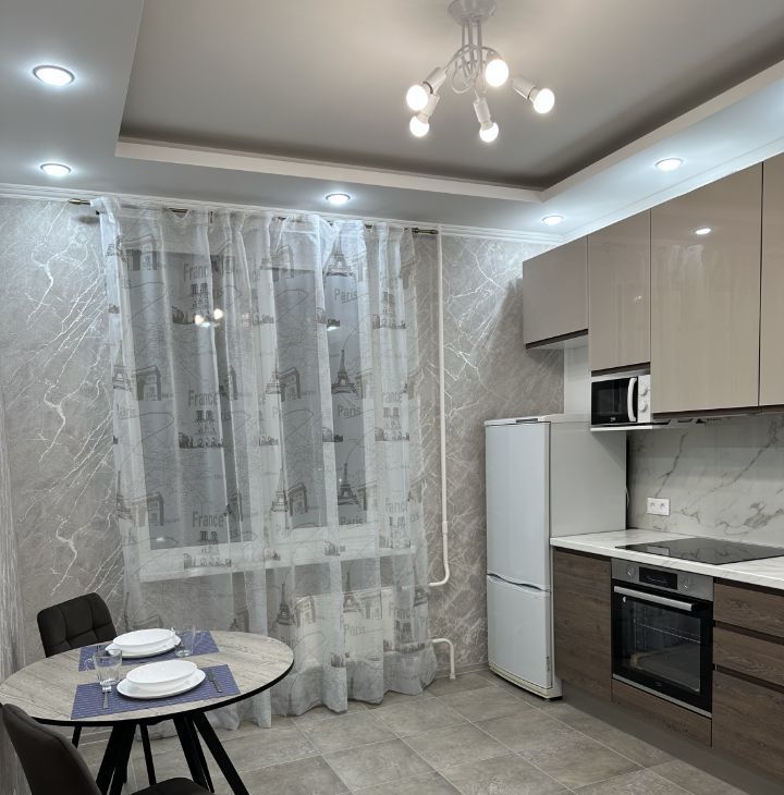 Кухня оснащена посудомойкой, индукционная варочная панель, духовка, микроволновка, холодильник, вытяжка. Стоит фильтр для воды. Столовый сервиз на 6 персон и столовые приборы.