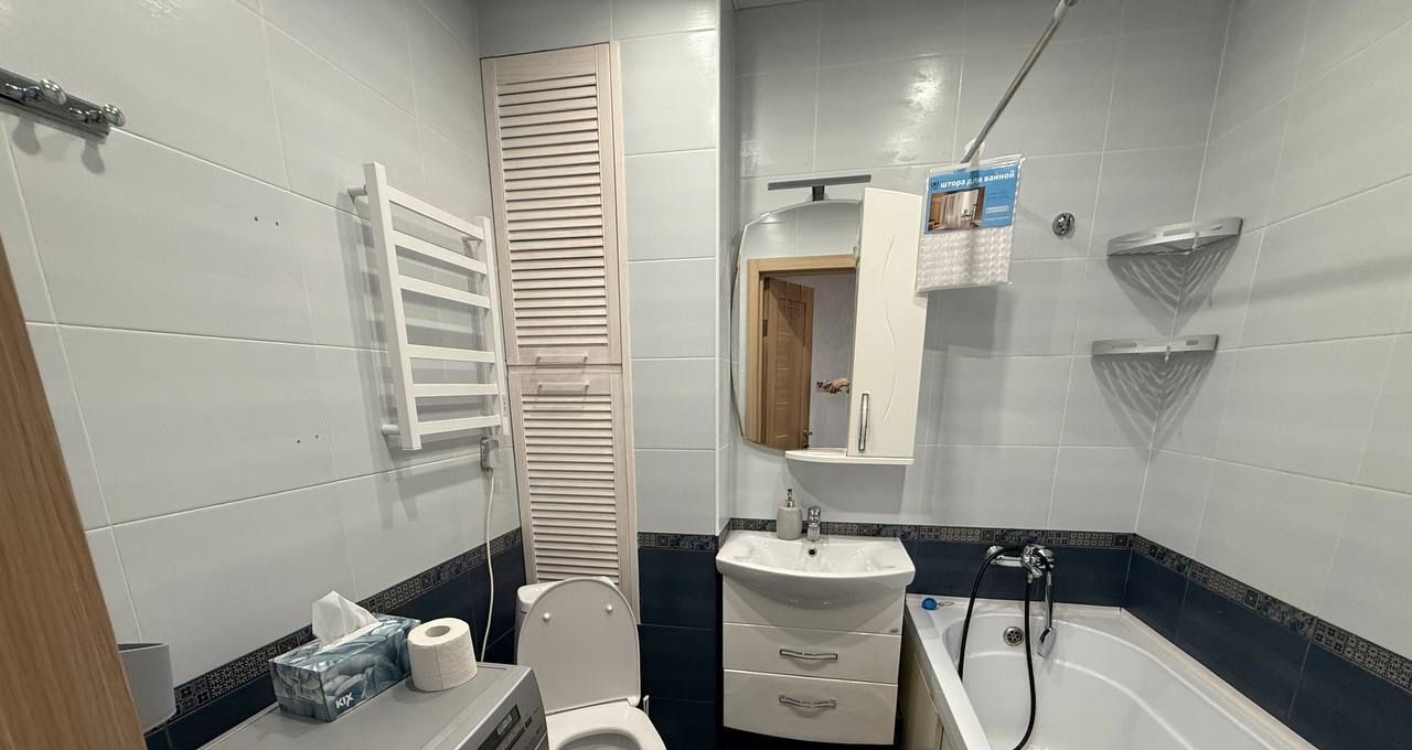 Совмещенный санузел с доступом к счетчикам, стиральная машина, зеркало с подсветкой и розеткой, шкафчик для хранения, корзина для белья и этажерка.