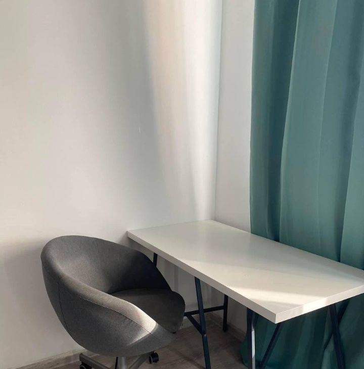 Комната: кровать 140 см, 2 тумбы, стеллаж, рабочее место (стол 120см и стул), большой шкаф-купе, блекаут шторы.