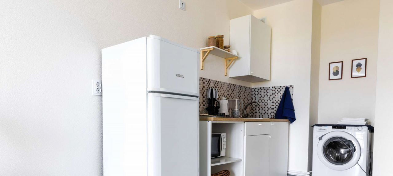 У нас есть двуспальная кровать с ортопедическим матрасом, постельные принадлежности, чайник, ванна, туалет, фен, утюг, сушилка, микроволновая печь, электрическая плита, стиральная машина, холодильник, вся необходимая посуда включая сковородки и кастрюли и обеденный стол на 3 персоны.